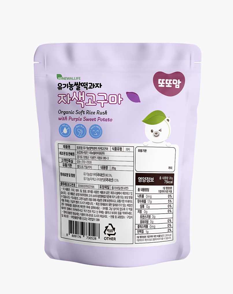 Thương hiệu: DDODDOMAM - Renewal Life, tập đoàn hàng đầu Hàn Quốc về sản xuất thực phẩm ăn nhẹ an toàn cho trẻ nhỏ Xuất xứ: Hàn Quốc Quy cách đóng gói: 20g - Túi zip có khóa kéo chống nước Kích thước: hình dẹt 180x235x90mm Thành phần: Gạo hữu cơ Hàn Quốc (98.5%), Bột khoai lang tím hữu cơ Hàn Quốc (1.5%) Đặc điểm sản phẩm: - Nguyên liệu hoàn toàn hữu cơ, được trồng tại vùng trồng hữu cơ...