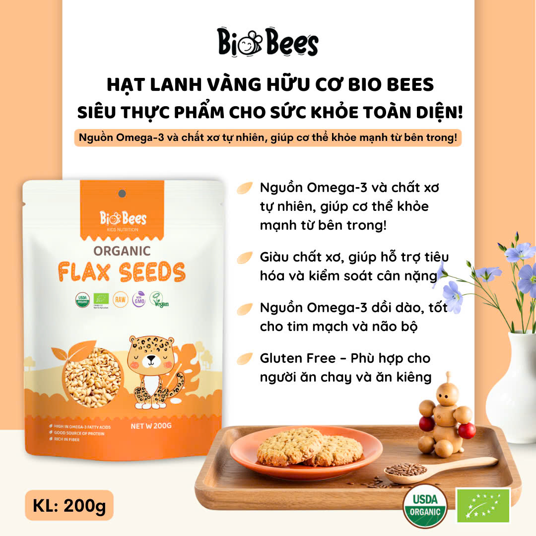 Sản phẩm được chứng nhận hữu cơ theo tiêu chuẩn hữu cơ USDA Organic (Hoa Kỳ) và EU Organic (Châu Âu) Xuất xứ: Trung Quốc Thành Phần: 100% hạt lanh vàng hữu cơ Quy cách đóng gói: 200gr/túi HSD: 02 năm kể từ ngày sản xuất Đặc điểm sản phẩm Hạt lanh vàng hữu cơ Bio Bees được trồng theo phương pháp hữu cơ, không chứa hóa chất, Non-GMO. Đây là một siêu thực phẩm giàu Omega-3, chất xơ,...