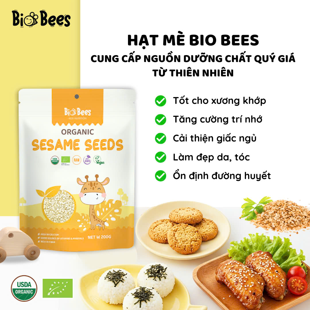 Sản phẩm được chứng nhận hữu cơ theo tiêu chuẩn hữu cơ USDA Organic (Hoa Kỳ) và EU Organic (Châu Âu) Xuất xứ: Trung Quốc Thành Phần: 100% hạt vừng hữu cơ Quy cách đóng gói: 200gr/túi HSD: 02 năm kể từ ngày sản xuất Đặc điểm sản phẩm Hạt vừng/mè trắng hữu cơ Bio Bees được tuyển chọn từ những hạt vừng tinh khiết, canh tác theo phương pháp hữu cơ, không hóa chất, không biến đổi gen...