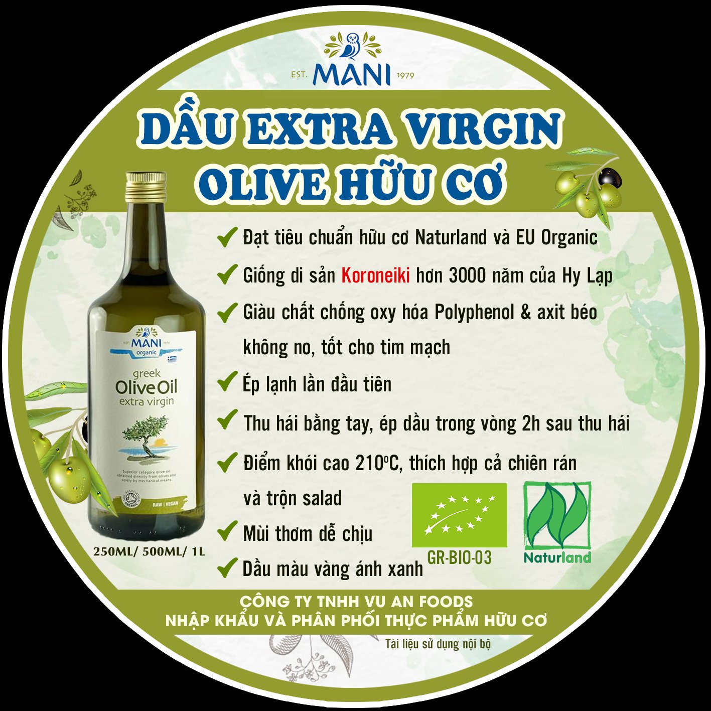 Một vài đặc điểm khiến chất lượng dầu Extra Virgin Olive Hữu Cơ hiệu Mani trở lên khác biệt: