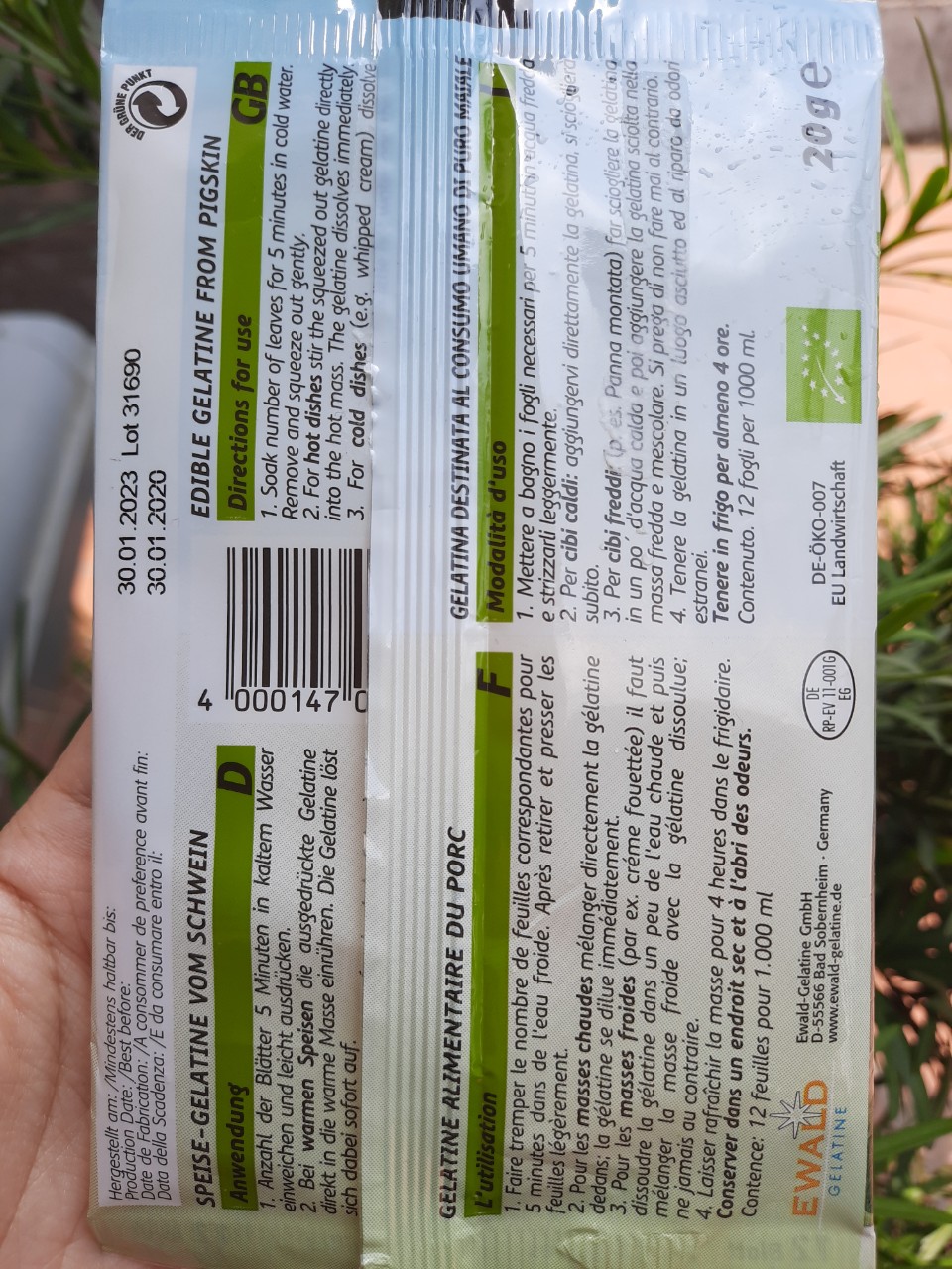 Trong quy trình sản xuất đặc biệt của Ewald-Gelatine, da heo ( da lợn ) trải qua quá trình làm sạch cẩn thận. Dịch chiết cuối cùng có độ pH trong khoảng 3-4. Các giai đoạn của quá trình sản xuất như lọc, làm đặc, khử trùng, sau đó là sấy khô để cho ra một loại gelatine dạng miếng đặc biệt. Quá trình sản xuất này sử dụng với máy móc công nghệ cao, tự động hóa và cực kỳ an toàn để đạt tiêu chuẩn hữu cơ quốc tế EU Organic. Nên bạn hoàn toàn có thể an tâm sử dụng.