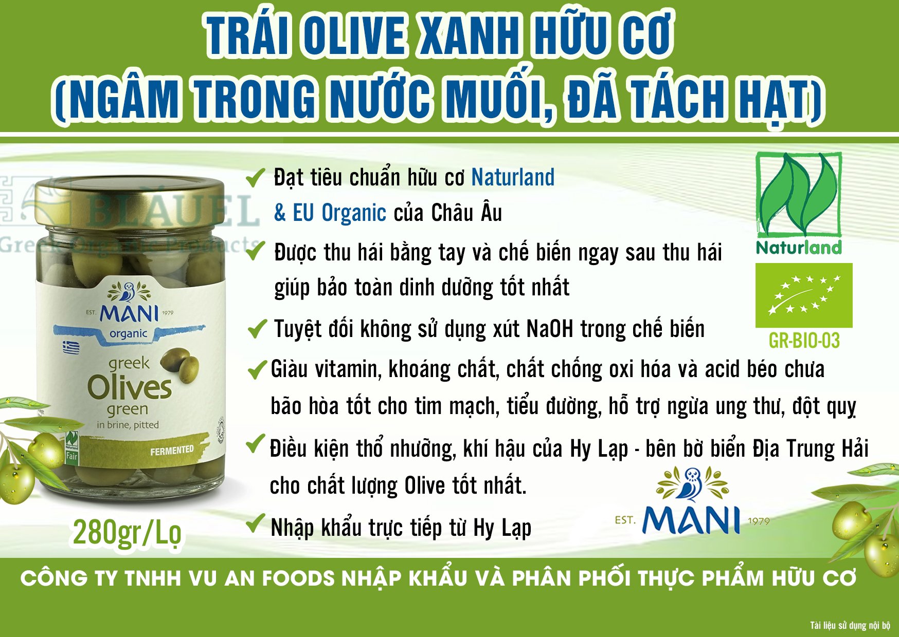 Mani là thương hiệu tiên phong sản xuất dầu hữu cơ từ những năm 1980 tại đây. Khác với các loại Olive khác, những cây Olive được canh tác truyền thống, thu hoạch cẩn thận bằng tay, và xử lý ngay sau khi thu hoạch là một phần giúp cho chất lượng sản phẩm của Mani luôn vượt trội. Quá trình canh tác, sản xuất hoàn toàn tuân thủ nghiêm ngặt theo các quy định của Naturland và EU Organic. Một điểm nổi bật nữa của Trái Olive Xanh Konservoeliá hữu cơ của thương hiệu Mani đó chính là quá trình xử lý làm giảm độ chát và lên men nhẹ của quả Olive diễn ra trong thời gian 6 tháng giúp tạo hương vị đậm đà, loại bỏ hoàn toàn vị chát, có vị chua nhẹ vô cùng dễ chịu.