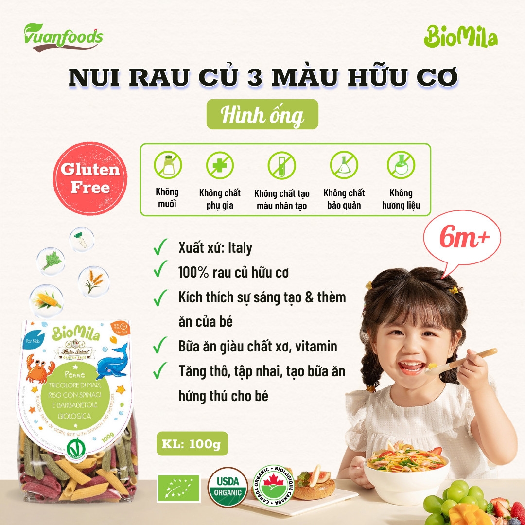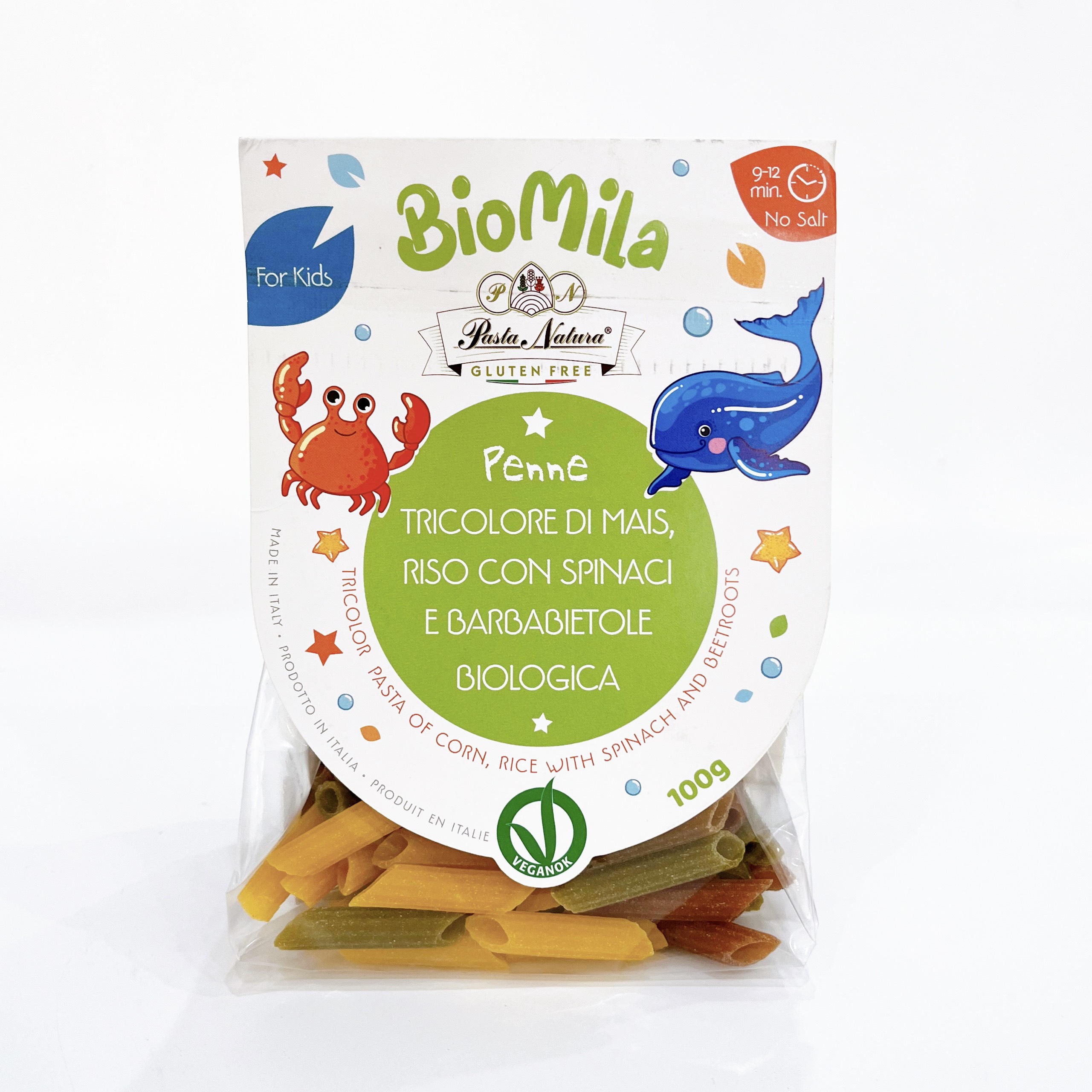 Nui mì rau củ 3 màu hữu cơ BioMila hình ống 100g cho bé từ 6 tháng