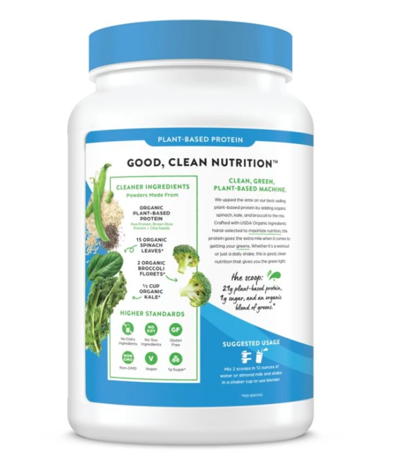 Thành phần: hỗn hợp đạm thực vật hữu cơ Orgain (đạm đậu hà lan*, đạm gạo lứt*, đạm hạt chia*), hương tự nhiên*, hỗn hợp kem hữu cơ Orgain (keo*, dầu hướng dương hàm lượng cao acid olelic*, dextrin gạo*, lecithin hướng dương*, dịch chiết hương thảo*), erythritol*, hỗn hợp xanh hữu cơ Orgain (cải bó xôi*, bông cải xanh*, cải xoăn kale*), hương tự nhiên, muối biển, keo*, gôm guar*, dịch chiết cỏ ngọt*, gôm xanthan.
