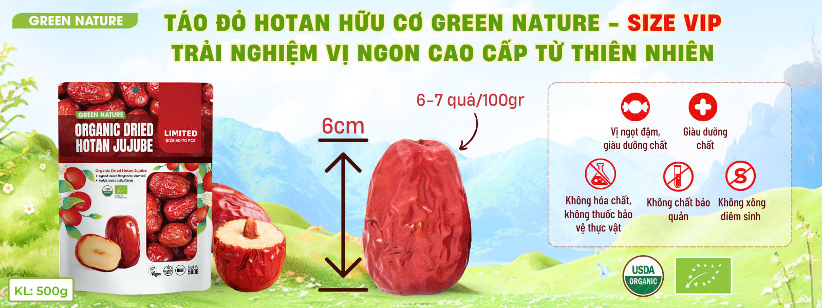 Sản phẩm được chứng nhận hữu cơ theo tiêu chuẩn hữu cơ USDA Organic (Hoa Kỳ) và EU Organic (Châu Âu) Xuất xứ: Tân Cương, Trung Quốc Thành Phần: 100% táo đỏ hữu cơ. Quy cách đóng gói: 500gr/túi - 12 túi/thùng Size quả: 6-7 trái/100gr HSD: 02 năm kể từ ngày sản xuất Đặc điểm sản phẩm Táo đỏ Hotan hữu cơ Green Nature size VIP với size quả bự nhất 6-7 trái/100gr - Size to nhất trên...